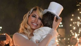 Con un vestido con tull blanco, la rubia llegó como una verdadera novia junto a su galán, también vestido de blanco y galera, con una hilera de bengala que la esperaban.